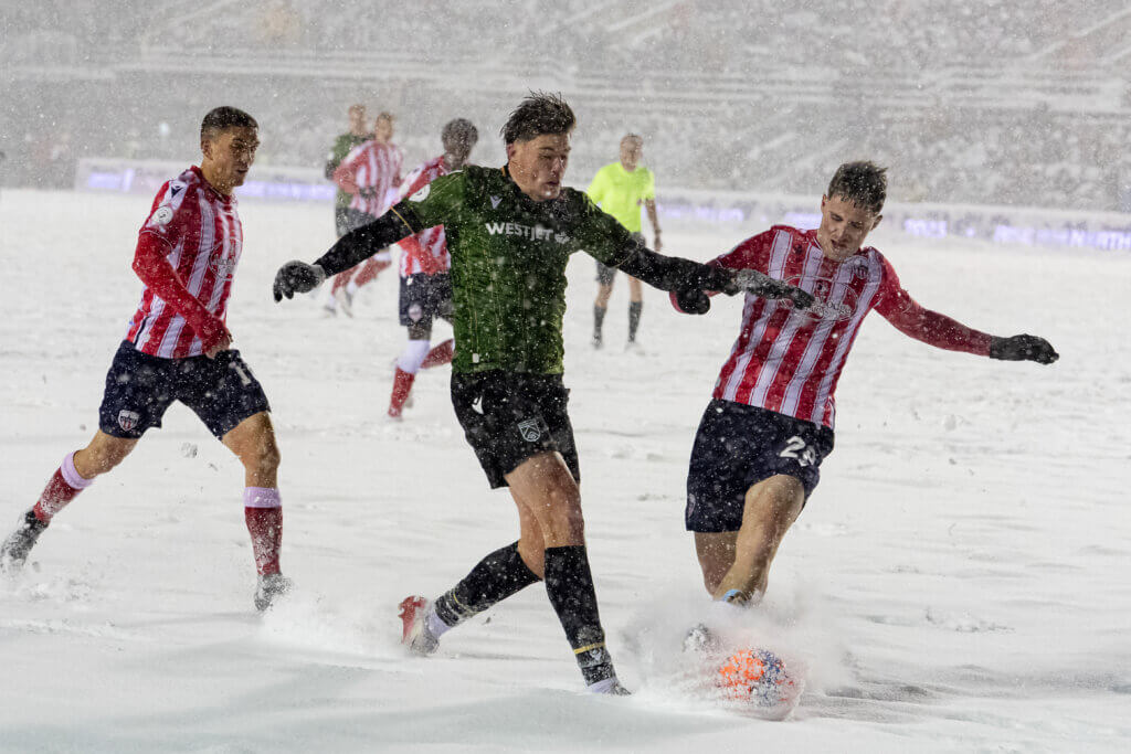 Décalée de 30 minutes, la rencontre s’est bien tenue sous une neige abondante, qui s’est épaissie sur le terrain au fil des minutes, nécessitant des pauses tous les quarts d’heure pour nettoyer les lignes. Malgré ces conditions, dans lesquelles il n’y a qu’au Canada qu’on joue au soccer, les deux équipes sont parvenues à livrer un spectacle respectable en première mi-temps avec deux buts inscrits.